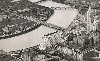 Following a local version of the City Beautiful movement, the Columbus Plan first envisioned a riverfront civic center in 1908. The plan aimed to visually unite both banks of the river along with the nearby Capitol Square, and build classically-inspired yet simple buildings, surrounded by open spaces, parks, and parkways. Development was slow, though the Great Flood of 1913 in Columbus dramatically affected the area, destroying many riverfront buildings and both of its bridges. It gave the city the opportunity to redevelop the riverfront into its planned civic center, though with added flood control - a retaining wall and low head dam. The civic center layout was expanded to two to three times its original size. From 1917 to 1922, the Broad Street and Town Street Bridges, parallel Neoclassical structures, were built, along with the still-intact retaining wall between the bridges.[6][2] In the early 1920s, the plan included a Masonic temple at the current site of the federal courthouse, and a park for World War I veterans at the site of the Judicial Center.[5]
