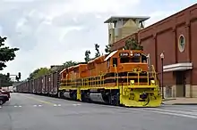 Columbus and Chattahoochee Railroad (reporting mark CHH) is a 26-mile-long (42 km) freight railroad running from Girard, Alabama, to Mahrt, Alabama[1] and has shared trackage rights with the Norfolk Southern to use the track between NS Columbus yard in Columbus, Georgia and Girard, AL. This track runs concurrent with 9th St. in downtown Columbus and is shared as part of the designated yard limits for Columbus Yard. CHH interchanges with the Norfolk Southern at Columbus Yard. Locomotives are kept at the yard and crew office for Georgia Southwestern Railroad yard in Columbus. (Sister railroad of the parent company, Genesee & Wyoming)