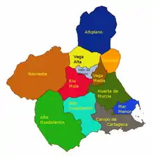 - According to Zorita y Calvo (1984): Altiplano, Noroeste, Vega Alta, Valle de Ricote, Vega Media, Comarca Oriental, Río Mula, Huerta de Murcia, Alto Guadalentín, Bajo Guadalentín, Campo de Cartagena and Mar Menor.[20]