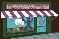 Comic Book Guy is the owner of The Android's Dungeon & Baseball Card Shop, a local comic book store. The comics, collectibles, and toys he sells are of wildly varying quality and often have very high prices. His store is his sanctuary, where he holds some level of self-esteem, imperiously lording over pre-teen kids, like Bart Simpson and Milhouse Van Houten, using a heavily sarcastic tone and often banning certain customers for minor infractions. His store contains a lower level full of illegal videos (which include Mr. Rogers drunk, Alien autopsy, Illegal Alien Autopsy, a "good version" of The Godfather Part III, and Kent Brockman picking his nose).[18]