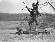 The 1st Commando Brigade next took part in Operation Plunder, the crossing of the Rhine River in March 1945. After a heavy artillery bombardment on the evening of 23 March 1945, the brigade carried out the initial assault under cover of darkness with the 15th (Scottish) Division and the 51st (Highland) Division. The Germans had moved most of their reserve troops to the Ludendorff Bridge at Remagen, which had just been captured by the U.S. 9th Armored Division.[90] The Commandos crossed the Rhine at a point 2-mile (3.2 km) west of Wesel. Their crossing was unopposed and the brigade headed to the outskirts of Wesel. Here they waited until a raid of 200 bombers of the Royal Air Force finished their attack, during which over 1,000 tons of bombs were dropped. Moving into the city just after midnight, the Commandos met resistance from defenders organised around an anti-aircraft division. It was not until 25 March that all resistance ended and the brigade declared the city taken.[91]