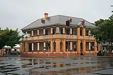 The bitumenised courtyard between the main building and the stables building is enclosed along Maryborough Street by a timber paling fence with capping rail. There are double gates in this fence which allow vehicle access to the site. To the east of the main building, fronting Bourbong Street, there is a low masonry fence with a small pedestrian gateway enclosing parking space accessed from the side street. The rear of the site, fronting Post Office Lane, is enclosed with a modern wire fence.[1]