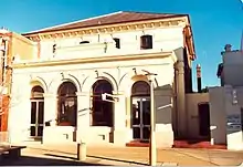 The building is a two-storey brick building, rendered and painted on the street side only. The facade is symmetrical and the street level portico has four round arches. A decorative central parapet with scrolled edges rises above the portico, and the upper storey has four segmental-arch openings with double hung sash windows. The slate roof has been described as hipped (Heritage Office File); photographs seem to indicate that it may even be pyramidal.[1]