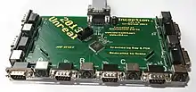 Supports 8 SNES pads at the joyports. Designed by Ninja of The Dreams.[8]