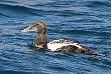 The common eider (pronounced /ˈaɪ.dər/) (Somateria mollissima), also called St. Cuthbert's duck or Cuddy's duck, is a large (50–71 cm (20–28 in) in body length) sea-duck that is distributed over the northern coasts of Europe, North America and eastern Siberia. It breeds in Arctic and some northern temperate regions, but winters somewhat farther south in temperate zones, when it can form large flocks on coastal waters. It can fly at speeds up to 113 km/h (70 mph).[2]
