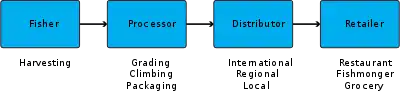 As for seafood supply chains in general, the supply chain consists of a collector, processor, distributor and finally the retailer. The true nature of the supply chain is usually more complex and opaque, with the potential for records of harvesting areas and date of catch to be falsified.