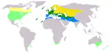 Common starlings in the south and west of Europe and south of latitude 40°N are mainly resident,[24] although other populations migrate from regions where the winter is harsh, the ground frozen and food scarce. Large numbers of birds from northern Europe, Russia and Ukraine migrate south westwards or south eastwards.[20][28] In the autumn, when immigrants are arriving from eastern Europe, many of Britain's common starlings are setting off for Iberia and North Africa. Other groups of birds are in passage across the country and the pathways of these different streams of bird may cross.[20] Of the 15,000 birds ringed as nestlings in Merseyside, England, individuals have been recovered at various times of year as far afield as Norway, Sweden, Finland, Russia, Ukraine, Poland, Germany and the Low Countries.[93] Small numbers of common starling have sporadically been observed in Japan and Hong Kong but it is unclear from where these birds originated.[28] In North America, northern populations have developed a migration pattern, vacating much of Canada in winter.[94] Birds in the east of the country move southwards, and those from further west winter in the southwest of the US.[15]