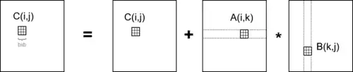 C(i,j) = C(i,j) + A(i,k) * B(k,j) - {do a matrix multiply on blocks}