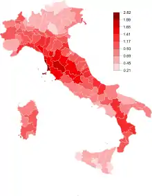 Support for the Communist Party is stronger in central Italy in particular in Tuscany and Umbria. The party ran in all the constituencies of Italy for the first time in the 2019 European Parliament election. It made its best results in Tuscany (1.68%), in particular in the province of Livorno (2.82%) and in the province of Siena (1.89%), while it was weaker in South Tyrol (0.21%), Trentino (0.49%), and Sicily (0.46%).[31]