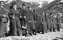 The Macedonian Bureau of KKE organised the first two partisan units at the end of June 1941. The first was based in Kilkis and was named Athanasios Diakos, the second was based in Nigrita and was named Odysseas Androutsos. These small partisan units blew up bridges, attacked police stations and eventually organized into larger combat units of more than 300 men each.[60] In several other places and in major cities, small armed groups of KKE members and non-communists began to emerge, protecting people from looters, the Germans, or collaborators.[61] On 27 September 1941, Greek communists together with five other leftist parties formed the National Liberation Front (EAM) in Kallithea, Athens and began forming partisan militia units.