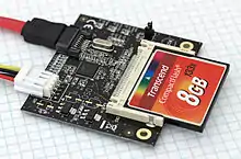 In early 2008, the CFA demonstrated CompactFlash cards with a built in SATA interface.[28] Several companies make adapters that allow CF cards to be connected to PCI, PCMCIA, IDE and SATA connections,[29] allowing a CF card to act as a solid-state drive with virtually any operating system or BIOS, and even in a RAID configuration.