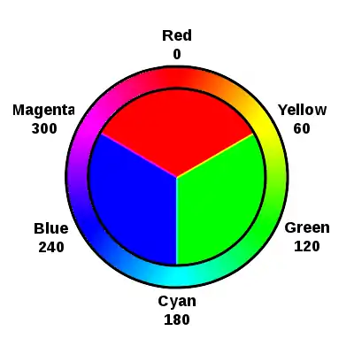A color wheel is a tool that provides a visual representation of the relationships between all possible hues. The primary colors are arranged around a circle at equal (120 degree) intervals. (Warning: Color wheels frequently depict "Painter's Colors" primary colors, which leads to a different set of hues than additive colors.) The illustration shows a simple color wheel based on the additive colors. Note that the position (top, right) of the starting color, typically red, is arbitrary, as is the order of green and blue (clockwise, counter-clockwise). The illustration also shows the secondary colors, yellow, cyan, and magenta, located halfway between (60 degrees) the primary colors.