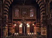 Inside, the vestibule features another ornate groin-vault ceiling and leads to the main sanctuary hall which follows a modified layout of the classic madrasa, with two large iwans on the qibla axis and two shallow or reduced iwans to the sides.[1]:245 The hall is richly decorated in stone-carving, painted wooden ceilings and coloured windows. The mihrab is relatively modest but the wooden minbar is richly carved with geometric patterns and inlaid with ivory and mother-of-pearl.[7] The wooden lantern ceiling above the central space is notable for its carving and painted pattern but is a restoration work by the "Comité" and not the original.[2]:276 The central floor also features elaborate polychrome patterned marble but is usually covered by carpets.[7]