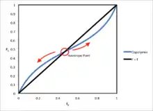 Binary copolymerization resembles distillation of a bicomponent liquid mixture with reactivity ratios corresponding to the ratio of vapor pressures of the pure components in the latter case. Distillation terminology is also borrowed for the case of azeotropic compositions in copolymer systems. Azeotropic points occur where is equal to . At these points, composition drift will not occur. The equation for the azeotropic concentration is shown below at the given reactivity ratios for each monomer species:[6]