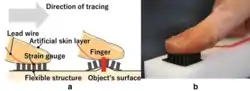 Materials such as rubber and silicon are being used to create sensors that allow for applications such as detecting micro undulations and calibrating robotic hands. Rubber can be used in order to create a mold that can be placed over a finger, inside of this mold would be multiple strain gauges. The finger mold and sensors could then be placed on top of a small sheet of rubber containing an array of rubber pins. A user can then wear the finger mold and trace a surface. A computer can then read the data from the strain gauges and measure if one or more of the pins is being pushed upward. If a pin is being pushed upward then the computer can recognize this as an imperfection in the surface. This sort of technology is useful in order to receive accurate data of the imperfections on a very large surface.[24] Another variation of this finger mold sensor are sensors that contain a camera suspended in silicon. The silicon forms a dome around the outside of the camera and embedded in the silicon are point markers that are equally spaced. These cameras can then be placed on devices such as robotic hands in order to allow the computer to receive highly accurate tactile data.[25]