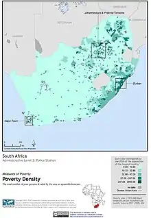 Concentrated poverty concerns the spatial distribution of socio-economic deprivation, specifically focusing on the density of poor populations.[1] Within the United States, common usage of the term concentrated poverty is observed in the fields of policy and scholarship referencing areas of "extreme" or "high-poverty." These are defined by the US census as areas where "40 percent of the tract population [lives] below the federal poverty threshold."[2] A large body of literature argues that areas of concentrated poverty place additional burdens on poor families residing within them, burdens beyond what these families' individual circumstances would dictate. Research also indicates that areas of concentrated poverty can have effects beyond the neighborhood in question, affecting surrounding neighborhoods not classified as "high-poverty" and subsequently limiting their overall economic potential and social cohesion. Concentrated poverty is a global phenomenon, with prominent examples world-wide.[3] Despite differing definitions, contributing factors, and overall effects, global concentrated poverty retains its central theme of spatial density. Multiple programs have attempted to ameliorate concentrated poverty and its effects within the United States, with varying degrees of progress and to sometimes detrimental effect.[4]