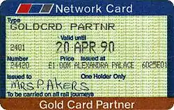 A card giving the same benefits, usually known as the Partner's Card but officially named Gold Card Partner's Network Card, is also available. Initially, Gold Card holders could have a free Network Card issued to them on behalf of a friend, relative or partner; but from 8 January 1989, the new Partner's Card (on dedicated APTIS ticket stock, form number BR 4599/69) was issued instead, at a cost of £1.00. A relative or friend of the Gold Card holder could be nominated, and the Partner's Card could be used independently of the Gold Card—the two cardholders did not have to travel together. The First Class Supplement benefit was withdrawn from Partner's Cards at the same time as from Network Railcards.[33] The card issued to the partner was later made once again a Network Railcard costing £1 and subject to the substantial minimum fare rule. This arrangement was eventually abolished in 2016; Gold Card holders may now purchase a 16–25 Railcard, Two Together Railcard, Disabled Person's Railcard, Senior Railcard, Network Railcard, or Family & Friends Railcard for themselves or anyone else for £10 by presenting the relevant application form and the Gold Card or Gold Record Card at a station in the Gold Card area.[31]