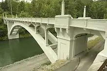 Built in 1916–1918 and so named for the Scottish immigrant, local settler, and Skagit County Commissioner who promoted its construction. The naming occurred after Henry Thompson was killed by a logging train in 1918.[8] At the time, its graceful arch was the longest single-span reinforced concrete bridge in the world[9] or perhaps just in the West[8] and has been listed on the Washington State and National Historic Register since 1976.[10] Until 1972, when the Washington State Department of Transportation re-routed Highway 20 (then known as Star Route 20) outside the town, the Thompson Bridge was the only connecting thoroughfare across the Baker River and into eastern Skagit County.