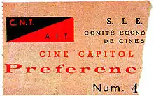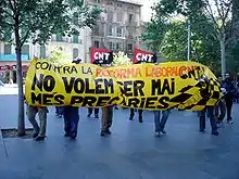 As a union organization, and in accordance with its bylaws, the aims of the CNT are to "develop a sense of solidarity among workers" hoping to improve their conditions under the current social system, and prepare them for future emancipation, when the means of production have been socialized, to practice mutual aid amongst CNT collectives, and maintain relationships with other like-minded groups, hoping for emancipation of the entire working class.[3] The CNT is also concerned with issues beyond the working class, desiring a radical transformation of society through revolutionary syndicalism.[4] To achieve their goal of social revolution, the organisation has outlined a social-economic system through the confederal concept of anarchist communism, which consists of a series of general ideas proposed for the organisation of an anarchist society.[5] The CNT draws inspiration from anarchist ideas, and also identifies with the struggles of different social movements. The CNT is internationalist, but also supports communities' right of self-determination and their sovereignty over the state.[6]