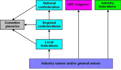 Unlike organizations that are organized from the top down, the CNT organises itself in an anarchistic fashion, from the bottom up, through different levels of confederations, following the Principle of Federation. The reason for favoring this structure is intended to limit homogeneity in committees, and keep them from having politics or programs. It is also intended to minimize the power of individuals who may be more active in the organization.[11]