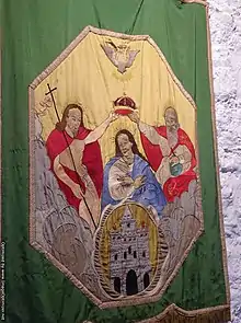 The Supreme Council also made its own seal, described as follows: "'Twas circular, and in its centre was a large cross, the base of which rested on a flaming heart, while its apex was overlapped by the wings of a dove. On the left of the cross was the harp , and on the right the crown." The motto on the seal was Pro Deo, Rege, et Patria, Hiberni Unanimes (For God, King and Fatherland, Ireland is United).[17]