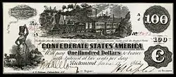 At first, Confederate currency was accepted throughout the South as a medium of exchange with high purchasing power. As the war progressed, however, confidence in the ultimate success waned, the amount of paper money increased, and their dates of redemption were extended further into the future.[2] Most Confederate currency carried the phrase across the top of the bill: "SIX MONTHS AFTER THE RATIFICATION OF A TREATY OF PEACE BETWEEN THE CONFEDERATE STATES AND THE UNITED STATES" then across the middle, the "CONFEDERATE STATES OF AMERICA WILL PAY [amount of bill] TO BEARER" (or "...WILL PAY TO BEARER [amount of bill]" or "...WILL PAY TO BEARER ON DEMAND [amount of bill]").