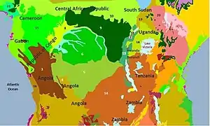 ![]() Congolian rainforest ecoregions: 2. Atlantic Equatorial coastal forests, 6. Central Congolian lowland forests 7. Eastern Congolian swamp forests, 8. Western Congolian swamp forests, 9. Northeastern Congolian forests, 15. Northwestern Congolian lowland forests | |