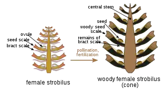 The female cone (megastrobilus, seed cone, or ovulate cone) contains ovules which, when fertilized by pollen, become seeds. The female cone structure varies more markedly between the different conifer families, and is often crucial for the identification of many species of conifers.