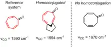 Homoconjugation[12] is an overlap of two π-systems separated by a non-conjugating group, such as CH2. Unambiguous examples are comparatively rare in neutral systems, due to a comparatively minor energetic benefit that is easily overridden by a variety of other factors; however, they are common in cationic systems in which a large energetic benefit can be derived from delocalization of positive charge (see the article on homoaromaticity for details.).[13] Neutral systems generally require constrained geometries favoring interaction to produce significant degrees of homoconjugation.[14] In the example below, the carbonyl stretching frequencies of the IR spectra of the respective compounds demonstrate homoconjugation, or lack thereof, in the neutral ground state molecules.