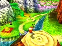 Following the success of Nintendo's Super Mario 64 (1996), a "barn" at Rare began conceiving and designing an un-named "generic 3D platform adventure" like it while it developed Killer Instinct Gold (1996).[20][21] Tim Stamper had planned the game to star a cute squirrel mascot named Conker from the get-go for it to have the widest possible appeal.[22] The staff of Project Dream saw the yet-to-be-named platform game during the creation of its engine, and was inspired to change Dream from an RPG to a platforming game in the visual and gameplay style of the Killer Instinct team's project.[23] Both upcoming Rare titles were first announced at the Electronic Entertainment Expo in June 1997, receiving the names Banjo-Kazooie and Conker's Quest,[24][25] the first two games presented by Nintendo at the event.[26]
