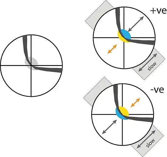 The optic axis figure of a biaxial mineral is more complex. One or two curved isogyres (sometimes called "brushes") will be visible, one of which will have its point of maximum curvature perfectly centred. (The figure shows an example with a single isogyre visible.) If two isogyres are visible, they will be positioned back-to-back. Rotating the stage will cause the isogyres to move and change shape strikingly - moving from a position where the isogyres curve smoothly and are widely separated at their closest point, then gradually becoming more tightly curved/squarer at their midpoints as they approach each other (a second isogyre appearing from out of the field of view if it was absent before), then merging to form a maltese cross pattern very much like that of a uniaxial mineral. Continuing to rotate the stage will cause the isogyres to separate again - but into the opposite quadrants to where they were previously - then meet again, then separate again into their original quadrants, and so on. The isogyres will touch each other four times in one 360 degree revolution, with each time corresponding to one of the extinction positions seen in normal cross polarised light.