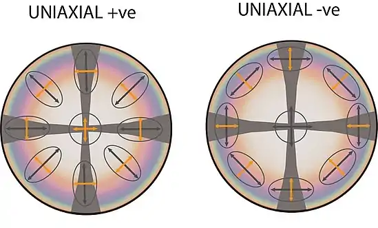 On either side of the "saddle" formed by the isogyres, birefringent rings of colour run concentrically around two eye like shapes called melanotopes. The closest bands are circles, but further out they become pear shaped with the narrow part pointing to the saddle. The larger bands surrounding the saddle and both melanotopes are figure 8 shaped.[1]