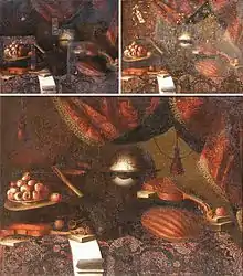The conservation and restoration of paintings is carried out by professional painting conservators. Paintings cover a wide range of various mediums, materials, and their supports (i.e. the painted surface made from fabric, paper, wood panel, fabricated board, or other). Painting types include fine art to decorative and functional objects spanning from acrylics, frescoes, and oil paint on various surfaces, egg tempera on panels and canvas, lacquer painting, water color and more. Knowing the materials of any given painting and its support allows for the proper restoration and conservation practices. All components of a painting will react to its environment differently, and impact the artwork as a whole.[1] These material components along with collections care (also known as preventive conservation) will determine the longevity of a painting.[2] The first steps to conservation and restoration is preventive conservation followed by active restoration with the artist's intent in mind.