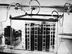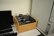 It is recommended that discs be cleaned before—and after—each playback, carbon-fibre brushes are quite effective. Records should be cleaned in a circular motion, in the direction of the grooves. Distilled water (not tap water as it will leave behind mineral deposits) and a soft, lint-free cloth is a common method of cleaning. Another method is to clean the LP on the turntable with a disc cleaning brush (the Discwasher system is frequently recommended by the audio press).[7] A simple "cleaning bath" device called the Spin Clean gives good results, and there are also vacuum machines on the market such as the Nitty Gritty, Keith Monks, Clearaudio, and VPI, which are recommended for more a thorough cleaning.[6] In recent years, ultrasonic cleaning machines from manufacturers such as Klaudio (Korea) and Audio Desk Systeme (Germany) have also been used with great success. The effectiveness of the ultrasonic machines coupled with their premium price tags (both $4,000 US in January 2015) has opened the door for companies to offer professional ultrasonic cleaning at an affordable cost of just a few dollars per record.[8] Another cleaning product recently released called Record Revirginizer uses a polymer that is applied to record surface then left to dry, the polymer is then peeled from the surface taking the microscopic contaminants with it.[9] Though in the past, using alcohol on vinyl LPs was considered safe, experts now caution against it unless absolutely necessary, as alcohol threatens the loss of the plasticizer or stabilizer.[10] As vinyl is often prone to electrostatic charges that cause dust and debris to be attracted to its surface, anti-static products can be used if needed.