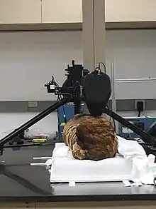 X-ray fluorescence spectroscopy (XRF) of the wooden, painted portrait of a Roman portrait mummy. The portable tool is hooked up to a rig that allows it to pan left and right, up and down, so as to scan the entire surface of the portrait. The height can also be manually adjusted to ensure focus is maintained. This technique provides information on the paints used which aids in provenance and compositional studies.- Can identify elements both on the surface and sub-surface by performing x-ray scans over the entirety of an artwork[42]