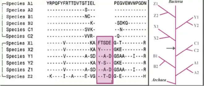 Figure 2 shows an example of 5aa CSI found in a conserved region that is commonly present in the species belonging to phyla X, Y and Z, but it is absent in other phyla (A, B and C). This signature indicates a specific relationship of taxa X, Y and Z and also A, B and C. Based upon the presence or absence of such an indel, in out-group species (viz. Archaea), it can be inferred whether the indel is an insert or a deletion, and which of these two groups A, B, C or X, Y, Z is ancestral.[6]