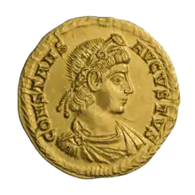 On 25 December 333, his father Constantine I elevated Constans to the imperial rank of caesar at Constantinople.[1] He was nobilissimus caesar alongside his brothers Constantine II and Constantius II.[1] Constans became engaged to Olympias, the daughter of the praetorian prefect Ablabius, but the marriage never came to pass.[5] Official imagery was changed to accommodate an image of Constans as co-caesar beside his brothers and their father the augustus.[6]