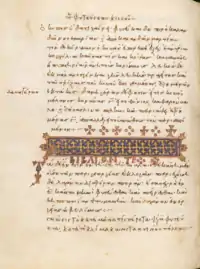 Constantine VII was recognized as a writer and scholar. He gathered a circle educated people and they are written several unfinished books with the completed book Life of Basil, grandfather of Constantine VII.[3] He wrote, or had commissioned, the works Geoponika ("On Agriculture", in Greek Τὰ γεοπονικά), a compilation of agronomic works from earlier Greek and Punic texts that are otherwise lost; De Ceremoniis ("On Ceremonies", in Greek, Περὶ τῆς βασιλείου τάξεως), describing the kinds of court ceremonies (also described later in a more negative light by Liutprand of Cremona); De Administrando Imperio ("On the Administration of the Empire", bearing in Greek the heading Πρὸς τὸν ἴδιον ὑιὸν Ρωμανόν),[2] giving advice on running the Empire internally and on fighting external enemies; a history of the Empire covering events following the death of the chronographer Theophanes the Confessor in 817; and Excerpta Historica ("Excerpts from the Histories"), a collection of excerpts from ancient historians (many of whose works are now lost) in four volumes (1. De legationibus. 2. De virtutibus et vitiis. 3. De insidiis. 4. De sententiis). Also amongst his historical works is a history eulogizing the reign and achievements of his grandfather, Basil I (Vita Basilii, Βίος Βασιλείου). These books are insightful and of interest to the historian, sociologist, and anthropologist as a source of information about nations neighbouring the Empire. They also offer a fine insight into the Emperor himself.