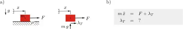 The two main approaches for modeling mechanical systems with unilateral contacts and friction are the regularized and the non-smooth approach. In the following, the two approaches are introduced using a simple example. Consider a block which can slide or stick on a table (see figure 1a). The motion of the block is described by the equation of motion, whereas the friction force is unknown (see figure 1b). In order to obtain the friction force, a separate force law must be specified which links the friction force to the associated velocity of the block.
