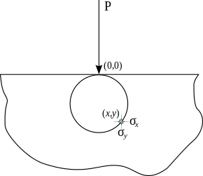 for some point, , in the half-plane. The circle shown in the figure indicates a surface on which the maximum shear stress is constant. From this stress field, the strain components and thus the displacements of all material points may be determined.