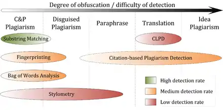 Comparative evaluations of content similarity detection systems[6][35][36][37][38][39] indicate that their performance depends on the type of plagiarism present (see figure). Except for citation pattern analysis, all detection approaches rely on textual similarity. It is therefore symptomatic that detection accuracy decreases the more plagiarism cases are obfuscated.