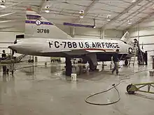 Proposals for the airframe were issued on 18 June 1950, and in January 1951 six manufacturers responded.[6] On 2 July 1954, three companies, Convair, Republic and Lockheed won the right to build a mockup. Until then, Convair had done research into delta-winged aircraft, experimenting with different designs, two of which fell under the name P-92. Of the three, the best design was to win the production contract under the name "Project MX-1554". In the end, Convair emerged as the victor with its design, designated "XF-102", after Lockheed dropped out and Republic built only a mockup.[5] The development of three different designs was too expensive and in November, only Convair was allowed to continue with its Model 8-80.[7] To speed development, it was proposed to equip the prototypes and pre-production aircraft with the less-powerful Westinghouse J40 turbojet. Continued delays to the J67 and MA-1 (formerly "MX-1179")[8] FCS led to the decision to place an interim aircraft with the J40 and a simpler fire control system (dubbed "E-9") into production as the F-102A. The failure of the J40 led to the Pratt & Whitney J57 turbojet with afterburner, rated with 10,000 pounds-force (44 kN) of thrust[9] being substituted for the prototypes and F-102As.[10][11] This aircraft was intended to be temporary, pending the development of the F-102B, which would employ the more advanced Curtiss-Wright J67, a licensed derivative of the Bristol-Siddeley Olympus which was still in development.[12] The F-102B would later evolve to become the F-106A, dubbed the "Ultimate Interceptor".[9]