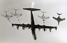 The six R3Y-2s were converted into four-point in-flight tankers using the probe-and-drogue method. In September 1956 one example was the first aircraft to successfully refuel four others simultaneously in flight in 1956, refuelling four Grumman F9F Cougars.