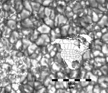 Granules on the photosphere of the Sun are the visible tops of convection cells in the photosphere, caused by convection of plasma in the photosphere. The rising part of the granules is located in the center where the plasma is hotter. The outer edge of the granules is darker due to the cooler descending plasma. A typical granule has a diameter on the order of 1,000 kilometers and each lasts 8 to 20 minutes before dissipating. Below the photosphere is a layer of much larger "supergranules" up to 30,000 kilometers in diameter, with lifespans of up to 24 hours.