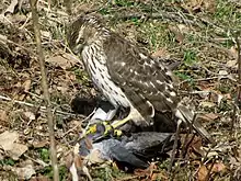 When hunting bats, they can follow all twists and turns, and may succeed in capture in up to 90% of hunts.[33] Much like goshawk, sometimes Cooper's hawks will capture rabbits by pursuing on the ground, half-running, half-flying.[33] Other on-foot hunting efforts, especially when chasing quail, have been detected as well.[7][62] When hunting sparrows, Cooper's hawks may make multiple passes on a bush before success and the efforts can take up to 45 minutes.[5] During hunts of rock doves (Columba livia) in urban areas, Cooper's hawks have been seen to engage in open air stoops to capture the prey.[164][165] An unusual harrier-like flight was seen in be engaged in by a Cooper's hawk before an attack on aquatic prey in a marsh.[5] Most prey is killed by repeatedly kneading the talons, with the kneading sometimes going on even after death, although in some cases birds are plucked while still alive.[5][166] Despite its gracile appearance, the Cooper's hawk, like the northern goshawk, is extremely powerful for its size and presumably able to capture larger prey relative to its size than other raptors such as falcons and Buteos (including red-tailed hawks (Buteo jamaicensis)) due to its unusually high-speed foot velocity and resulting impact during prey captures.[167][168] At times, after capture, Cooper's hawk have been seen to hold still living prey underwater, presumably trying to drown it.[5][169][170] Subsequent to the preys’ demise, they may eat the victim head first, followed by the viscera, with the meat eaten lastly.[56] Like other raptors who most regularly take birds, the Cooper's hawk was profiled in a study as an “attacker” rather than a “searcher” (i.e. mammal-hunters such as Buteos). “Attackers” such as Accipiters and large falcons usually had lower average hunting success rates, which averaged among the attacker species at 27%, due to the difficulty of capturing the prey.[171] 33% of 45 observed hunts in a study in Missouri were successful.[8] In Terre Haute, Indiana, about 23% of attacks by male Cooper's hawks and 20% by females were successful and were far more prone to being carried out in relatively open areas than those of nearby sharp-shinned hawk.[172] Post-fledgling pairs in Wisconsin were seen to hunt in sibling parties of 2–4, mainly pursuing chipmunks, and were observed to succeed in 56% of 18 hunting attempts.[173] During the first six weeks after the young hatch, in New York, it was estimated that a male Cooper's hawk would need to procure about 66 prey items over the period.[174] In these first six weeks in California, it was thought a minimum of 62 g (2.2 oz) would be required per nestling per day.[175]