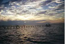 Copano Bay is approximately twelve-by-six-miles, oriented from the southwest to the northeast.[2] It is found mainly on undeveloped land, though ranches are located on parts of the west, south and north shores.[11] The main extensions include Mission Bay, which stretches to the north to the mouth of the Mission River, and Port Bay to the west, which forms the southern boundary of the Live Oak peninsula. The peninsula is located on the eastern shore of Copano Bay and is lined with beach homes and residences, which begin just west of the inlet Salt Lake to the head of Live Oak peninsula at the confluence of Copano and Aransas Bay. This opening is spanned by the Copano Bay Causeway and the Copano Bay Fishing Pier, which once served as the main crossing to the Lamar peninsula. Holiday Beach is found on the northeastern shore of Copano Bay on the Lamar Peninsula. Just north of the community is the mouth of Copano Creek, which marks the bay's northernmost point. From here, the shoreline turns to the southwest past the Copano Bay Oil and Gas Field and four sloughs before reaching the ruins of the ghost town Copano at Copano Point, marked by white cliffs. At the point, the Copano Reef juts out almost halfway across the bay. Further southwest, past the mouth of Mission Bay, Bayside stretches along the coast to the mouth of the Aransas River. The shoreline turns to the southeast from this point, past the Egery Flats and Egery Island through Swan Lake and to the mouth of Port Bay.[12]