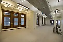 The interior space is relatively narrow compared to other Financial District buildings, being 46 feet (14 m) wide at its widest point.[25] There was a light court within the Corbin Building that illuminated the second through eighth stories, and has a large open staircase with wooden handrails, metal as well as railing panels and corner posts. An elevator bank is near the staircase.[21] The ground floor was used as a bank and had an open floor plan.[9][26] Girders were attached to metal columns between the first-floor ceiling and the building's roof, forming the light court.[9]
