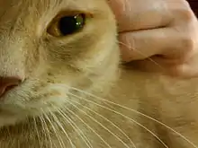 Corneal ulcers in cats can be caused by trauma, detergent burns, infections, and other eye diseases. One common cause not seen in dogs is infection with feline herpesvirus 1 (FHV-1). FHV-1 causes ulceration by direct infection of the epithelial cells. Lesions appear as round or dendritic (branching) ulcers. FHV-1 also suppresses healing of the cornea. Symptoms include conjunctivitis, squinting, eye discharge, and blood vessels on the cornea. It can cause severe scarring. Treatment is with topical antiviral drugs and antibiotics, and oral L-lysine, which competes with arginine and inhibits viral replication.[7]