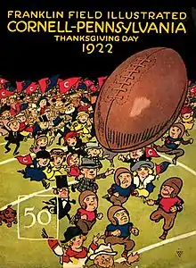 The Thanksgiving Cornell–Penn football game, broadcast on national radio before the television era, attracted huge crowds to Franklin Field in Philadelphia.[1] The 1931 game attracted a reported 70,000, and earned a story on the front page of the Philadelphia Inquirer along with a quarter-by-quarter breakdown of every detail of the game.[6] The 1947 game attracted a crowd estimated at "about 80,000".[7] The 1959 game attracted 23,661.[7] By 1965 attendance was down to 10,543, and the Thanksgiving tradition was ended and a standard home-and-away schedule was instituted.[7]