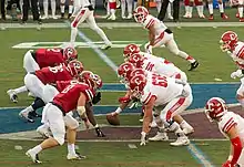 The Cornell–Penn football rivalry is an American college football rivalry between the Cornell Big Red and Penn Quakers.[1][2][3] Traditionally, the game was played on Thanksgiving Day in Philadelphia, Pennsylvania,[1] but now alternates between Philadelphia and Ithaca, New York. The game was often played as the last game of the regular season for both teams. Beginning in 2018, Cornell will face Columbia in the last game of the regular season, while Penn will face Princeton in the last game of the regular season. In the 125 meetings since 1893 (interrupted only in 1918), Penn leads the series 75–46–5, with Penn forfeiting the game in 1997 (because of the participation of an academically ineligible player).[4][5] Due to the COVID-19 pandemic, the 2020 Rivalry Game has been cancelled. This is the first time since 1918, after an uninterrupted streak of 101 games that a game has been cancelled.